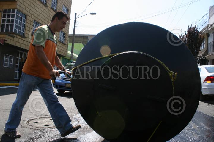 MEXICO D.F. 26AGOSTO2009.- Decenas de capitalinos de la delegación Iztapalapa, recibieron tinacos como parte del nuevo nuevo plan para contrarrestar los efectos de escasez de agua en la capital del país, este consiste en regalar tinacos de mil 100 litros de capacidad a familias de escasos recursos que viven en aquellas zonas donde es frecuente la falta del vital líquido, ya entregados los tinacos los iztapalapenses tuvieron que arreglárselas para trasportar estos tinacos a sus casas. FOTO:RICARDO CASTELAN/CUARTOSCURO.COM