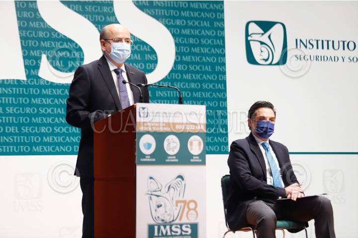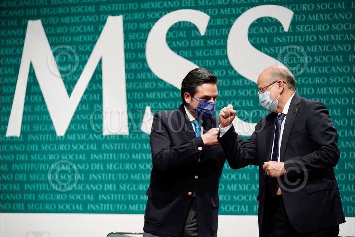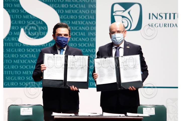 Zoé Robledo, director del IMSS, y Arturo Olivares Cerda, secretario general del SNTSS, encabezaron la firma del Contrato Colectivo de Trabajo 2021-2023.