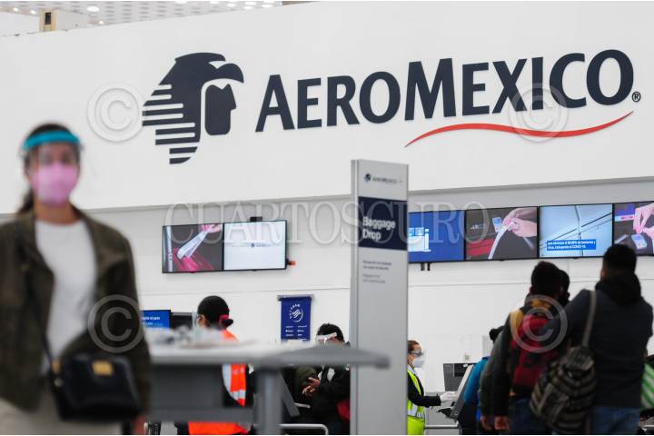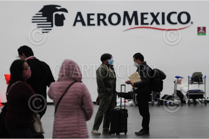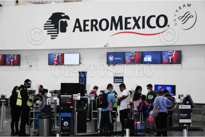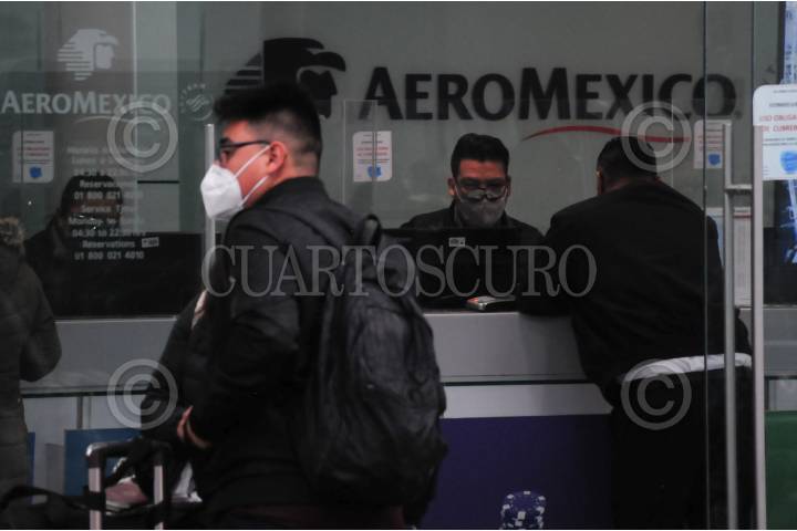 Pasajeros de la aerolínea Aeromexico pasan a ventanillas para recoger sus boletos.