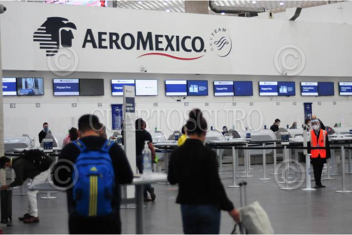 Pasajeros se registran en uno de los módulos de la aerolínea Aeromexico.