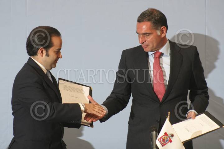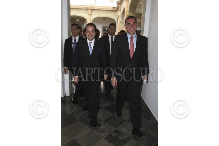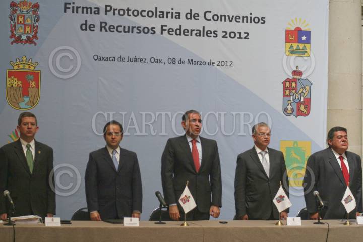 OAXACA, OAXACA 08MARZO2012.- Alejandro Poiré, secretario de Gobernación signo este jueves en el Palacio de Gobierno de Oaxaca junto con los gobernadores de Oaxaca, Tabasco y Campeche, Gabino Cué, Andrés Granier Melo y Fernando Ortega Bernés, respectivamente la Firma Protocolaria de Convenios de Recursos Federales 2012 que para este año transferirá 17 mil 311 millones de pesos a entidades de todo el país, incluyendo a las de la Zona Sur-Sureste, integrada por Oaxaca, Guerrero, Chiapas, Campeche, Tabasco, Quintana Roo y Yucatán. FOTO: ARTURO PÉREZ ALFONSO /CUARTOSCURO.COM