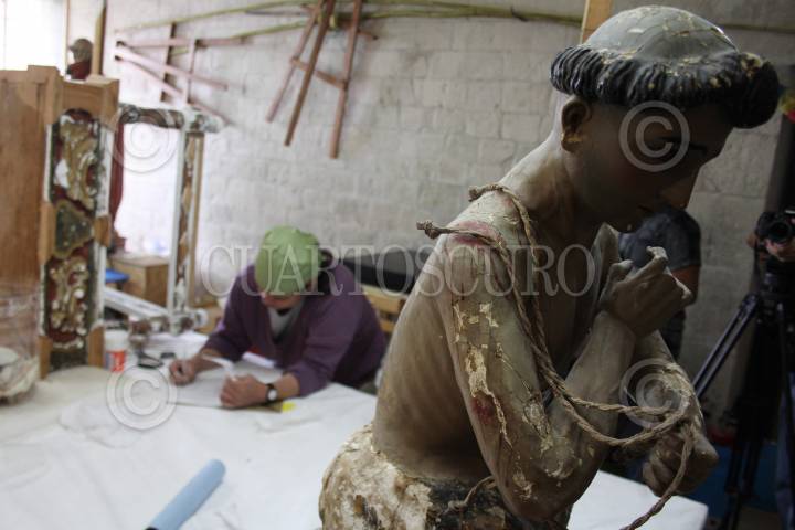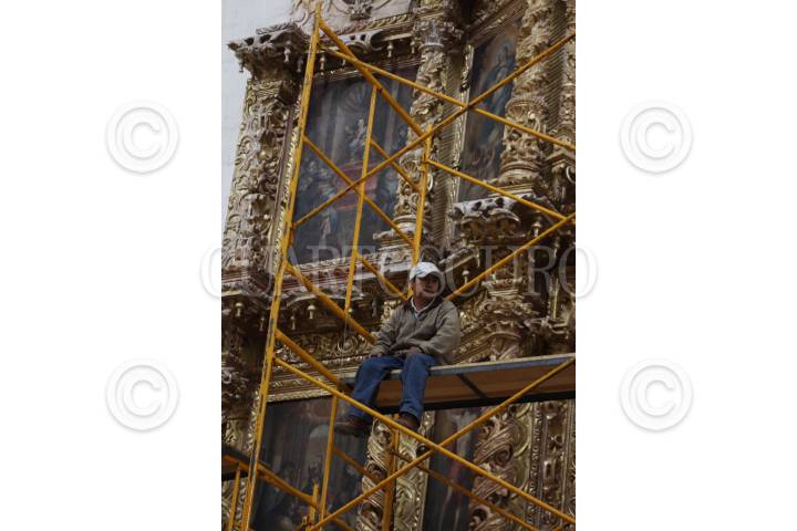 OAXACA, OAXACA, 13AGOSTO2011.- La fundación Alfredo Harp Helú trabaja desde el 2007 en el rescate del Ex Convento del Siglo XVI de Santo Domingo o San Pablo de Soriano o ubicado en pleno Centro Histórico de la ciudad de Oaxaca, para lo cual han adquirido seis de nueve propiedades las cuales forman parte de la estructura del inmueble. Durante los trabajos se detectaron vestigios arqueológicos de Montea Albán 1 aproximadamente de los años 300 o 500 antes de Cristo, así como adaptaciones de la época de la colonia y la revolución. Los empleados han utilizado diversos accesorios como escalpelos con los cuales han ido quitando distintas capas de pintura hasta llegar a las originales. El Ex Convento fue la primera casa de la orden dominica en Oaxaca. Entre los rescates han estado el Claustro, sotocoro, coro y la capilla. Los trabajos registran un avance del 70 por ciento y se espera concluyan para el mes de octubre y así pueda ser admirado por los habitantes de la ciudad de Oaxaca o turistas, informó el encargado de la obra, Sebastían Van Doesburg. FOTO: ARTURO PÉREZ ALFONSO/CUARTOSCURO.COM
