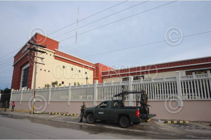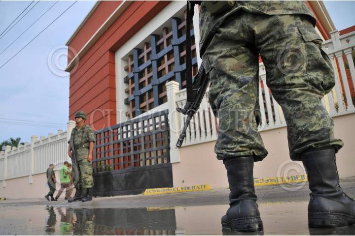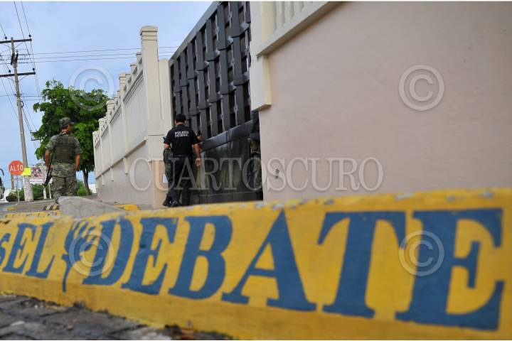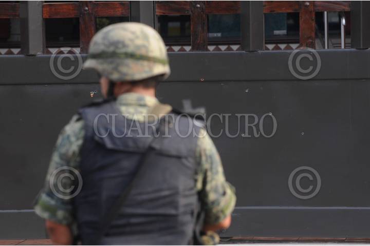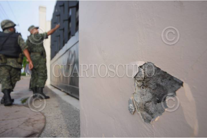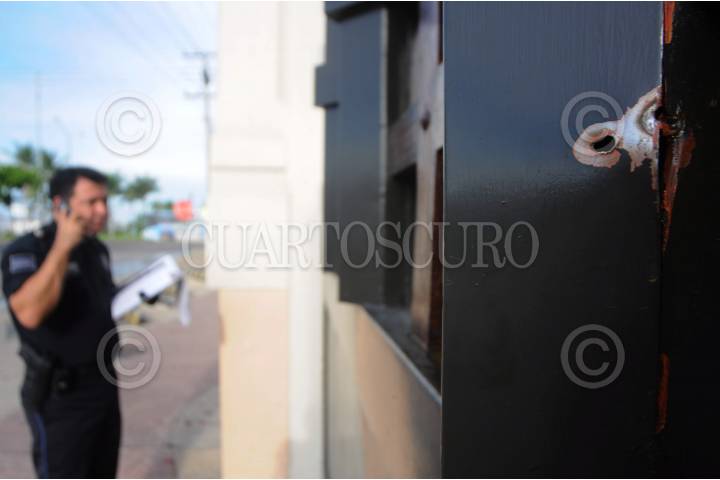 MAZATLÁN, SINALOA, 03OCTUBRE2010.- Esta madrugada las instalaciones de la cadena periodística El Debate fueron blanco de un ataque con disparos de fusiles automáticos en su fachada por lo que se convierte en el cuarto medio impreso que es atacado en Sinaloa. De acuerdo a reportes de la Policia Municipal, al filo de las 5:15 de la mañana, desconocidos dispararon por lo menos en 15 ocasiones, contra uno de los accesos del edificio ubicado en el fraccionamiento Costa Brava; previo al atentado, personal del periódico, recibió vía telefónica diversas amenazas anónimas que fueron registradas. FOTO: RODOLFO PATIÑO/EL DEBATE DE MAZATLÁN/CUARTOSCURO.COM
