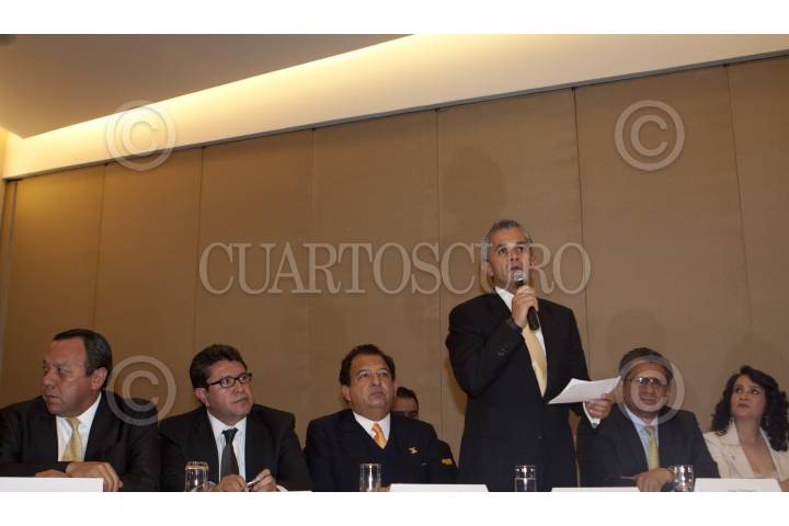 MÉXICO, D.F., 19ENERO2012.- Miguel Ángel Mancera, exprocurador de Distrito Federal resulto ganador de la encuesta con cual se convierte en el candidato del Movimiento Progresista, por parte del PRD; lo acompaña Jesus Zambrano, Ricardo Monreal, Luis Walton. FOTO: RODOLFO ANGULO/CUARTOSCURO.COM