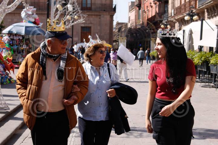 SAN LUIS POTOSÍ, SAN LUIS POTOSÍ, 06ENERO2025.- Una familia potosina transita en el centro de la ciudad con sus coronas como los tradicionales tres reyes magos. FOTO: MARCELO PALACIOS/CUARTOSCURO.COM