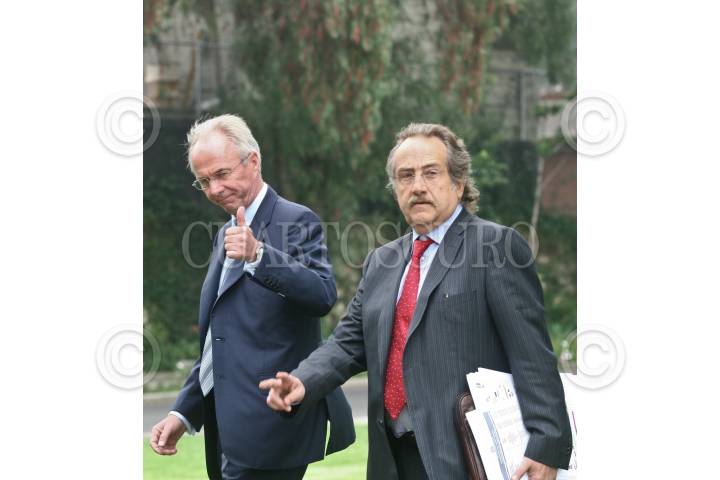 MÉXICO D.F., 28AGOSTO2008.- El técnico de la selección mexicana Sven Goran Eriksson acompañado por el Secretario General de la Federación Mexicana de Futbol, Decio de María, previo a la conferencia de prensa donde anunció la lista de convocados para la alineación tricolor, para los partidos de visita ante Jamaica y de local ante Canadá, el primero en Kingston el día 6 de septiembre y el segundo en Tuxtla Gutiérrez el 10. FOTO: SÁSHENKA GUTIÉRREZ/CUARTOSCURO.COM