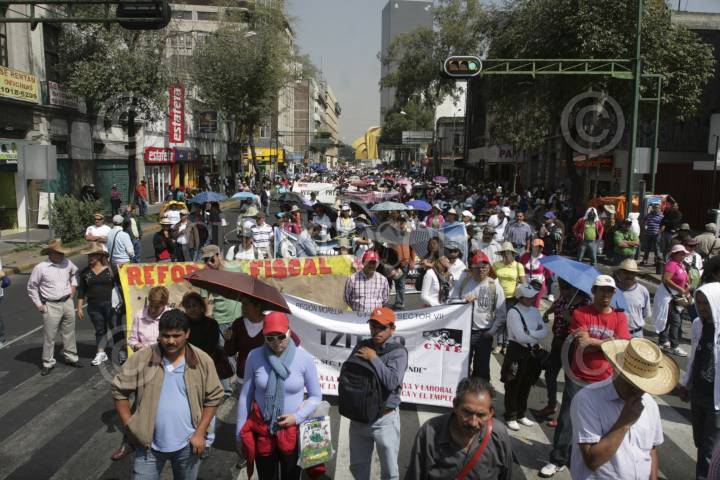 MÉXICO, D.F., 23OCTUBRE2012.- Tráfico ocasionado por la manifestación de maestros integrantes de la Seccion XVIII, provenientes de Michoacán, e integrantes de la Coordinadora Nacional de Trabajadores de la Educación (CNTE), quienes marcharon a la Secretaria de Gobernación para protestar por la Reforma Laboral en el Senado, también exigieron la liberación de estudiantes de las normales de su estado detenidos en Morelia. FOTO: JUAN PABLO ZAMORA /CUARTOSCURO.COM