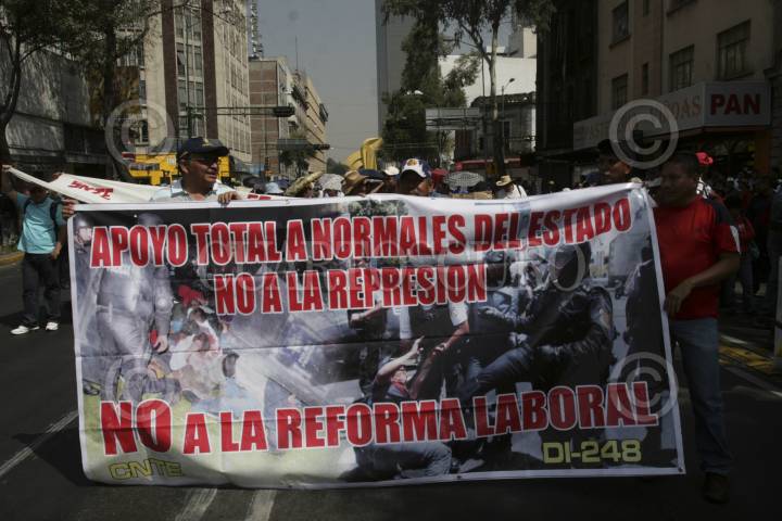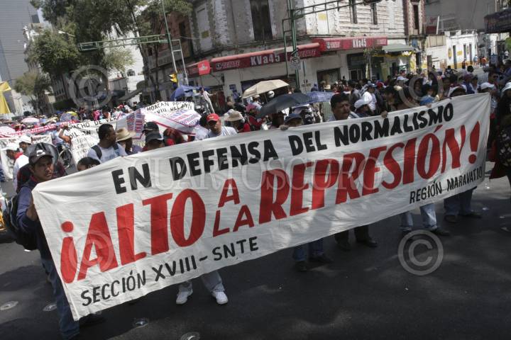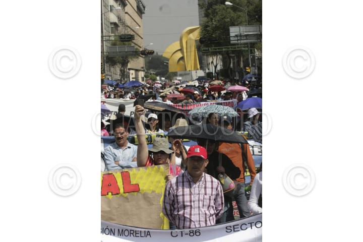 MÉXICO, D.F., 23OCTUBRE2012.- Maestros integrantes de la Seccion XVIII, provenientes de Michoacán, e integrantes de la Coordinadora Nacional de Trabajadores de la Educación (CNTE) marcharon a la Secretaria de Gobernación para protestar por la Reforma Laboral en el Senado, también exigieron la liberación de estudiantes de las normales de su estado detenidos en Morelia. FOTO: JUAN PABLO ZAMORA /CUARTOSCURO.COM