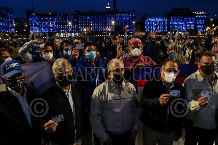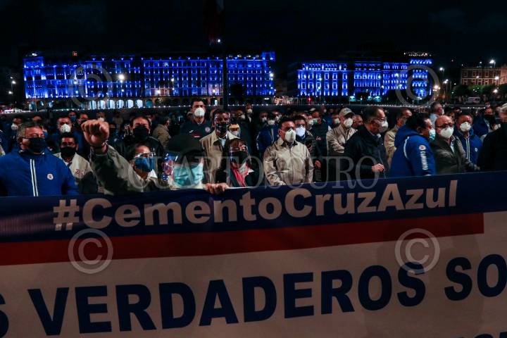Integrantes de la cooperativa Cruz Azul se manifestaron en la plancha del Zócalo en apoyo al presidente del club Cruz Azul, Billy Álvarez, acusado de manejo ilegal de recursos.