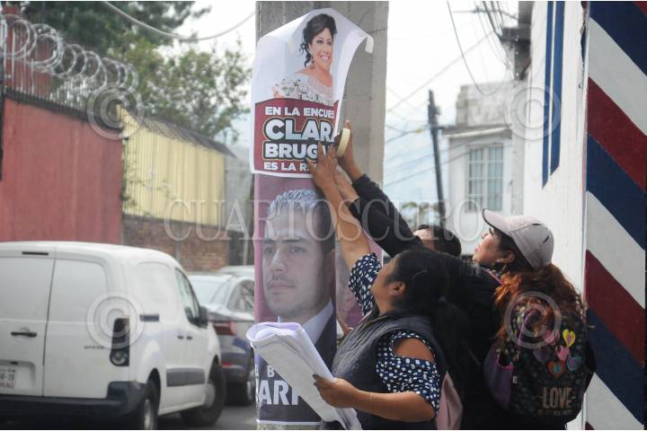 CIUDAD DE MÉXICO, 01OCTUBRE2023. - En las calles de la Magdalena Contreras, distintas personas colocan publicidad de los aspirantes de Morena, Omar García Harfuch y Clara Brugada, quienes buscan la candidatura a la jefatura de gobierno por parte de su partido. FOTO: DANIEL AUGUSTO /CUARTOSCURO.COM