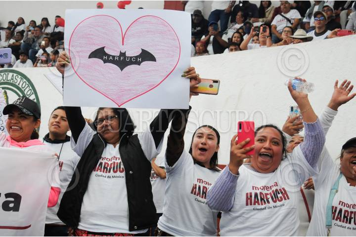 CIUDAD DE MÉXICO, 01OCTUBRE2023. Habitantes de la Magdalena Contreras reciben a Omar García Harfuch con distintas porras. FOTO: DANIEL AUGUSTO /CUARTOSCURO.COM