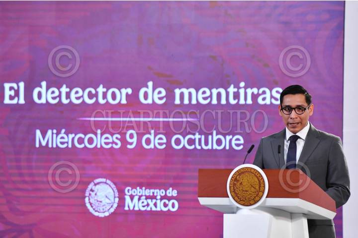 CIUDAD DE MÉXICO, 09OCTUBRE2024.- Miguel Ángel Lorsa, coordinador de Infodemia, durante la presentación de la sección "El detector de mentiras" en la "Mañanera del Pueblo" realizada en el salón Guillermo Prieto de Palacio Nacional. FOTO: MARIO JASSO/CUARTOSCURO.COM
