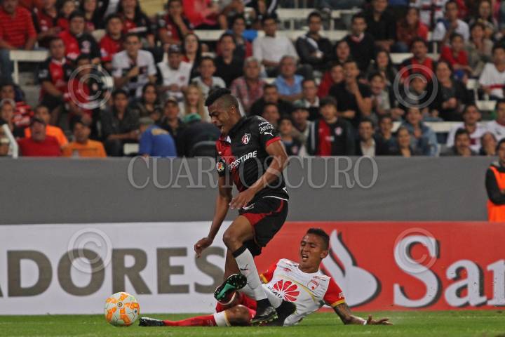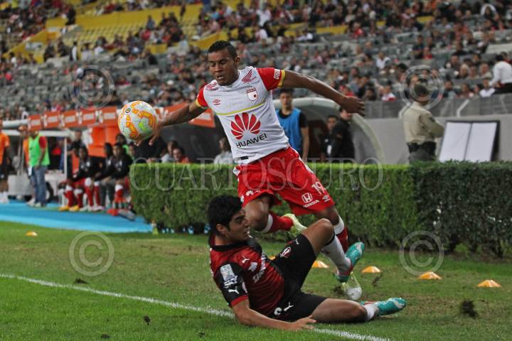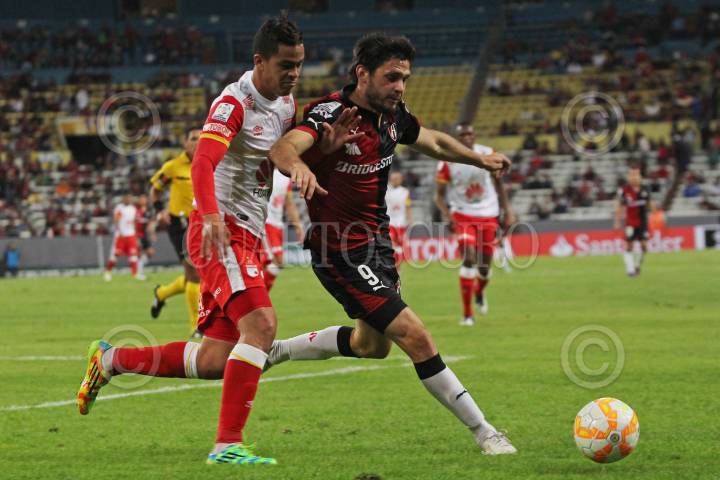GUADALAJARA, JALISCO. 17FEBRERO2015.- En la imagen el jugador del Independiente de Santa Fe (Colombia), Wilson Morelo, disputa un balón frente al contrario del Atlas de Guadalajara (México), Enrique Pérez, esto en partido correspondiente a la Fecha 1 de la Copa Bridgestone Libertadores, en donde se enfrentan los equipos del Atlas de Guadalajara (México) frente al Independiente de Santa Fe (Colombia), que se celebra en el Estadio Jalisco. FOTO: FERNANDO CARRANZA GARCIA/CUARTOSCURO.COM