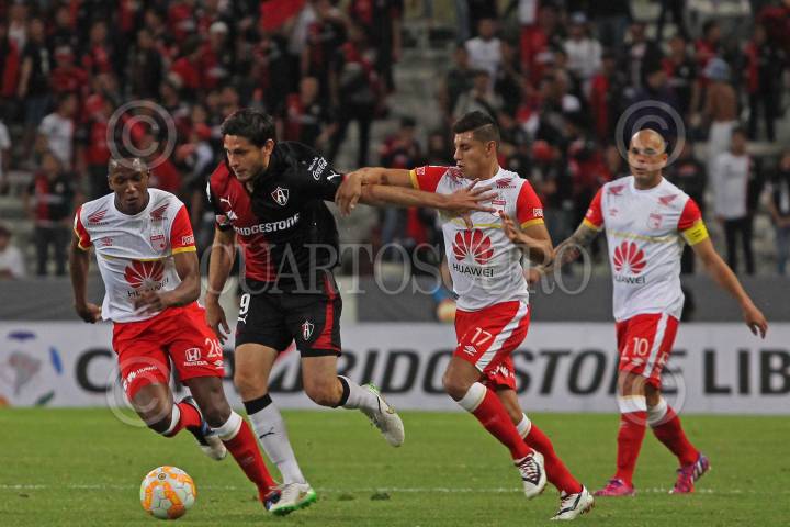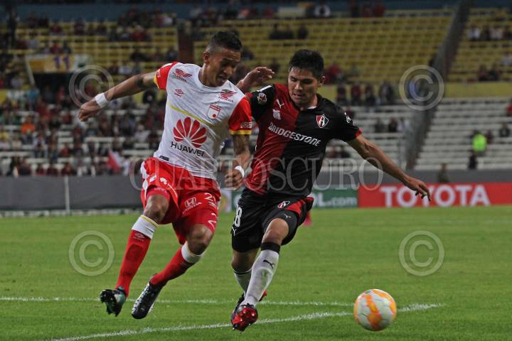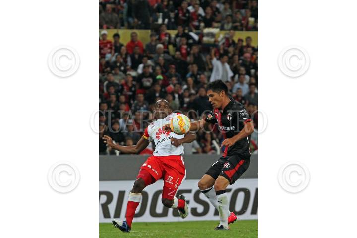 GUADALAJARA, JALISCO. 17FEBRERO2015.- En la imagen el jugador del Atlas de Guadalajara (México), Marcos Da Silva, disputa un balón frente al contrario del Independiente de Santa Fe (Colombia), Francisco Meza, esto en partido correspondiente a la Fecha 1 de la Copa Bridgestone Libertadores, en donde se enfrentan los equipos del Atlas de Guadalajara (México) frente al Independiente de Santa Fe (Colombia), en juego que se celebra en el Estadio Jalisco. FOTO: FERNANDO CARRANZA GARCIA/CUARTOSCURO.COM