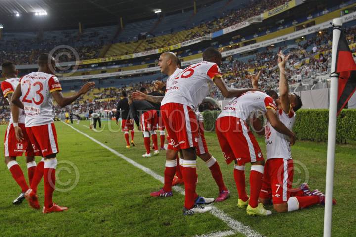 GUADALAJARA, JALISCO. 17FEBRERO2015.- En la imagen el jugador del Independiente de Santa Fe (Colombia), Luis Arias, celebra la anotación que le da el triunfo a su equipo, esto en partido correspondiente a la Fecha 1 de la Copa Bridgestone Libertadores, en donde se enfrentan los equipos del Atlas de Guadalajara (México) frente al Independiente de Santa Fe (Colombia), que se celebra en el Estadio Jalisco. FOTO: FERNANDO CARRANZA GARCIA/CUARTOSCURO.COM