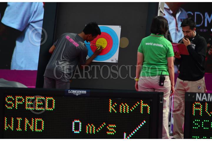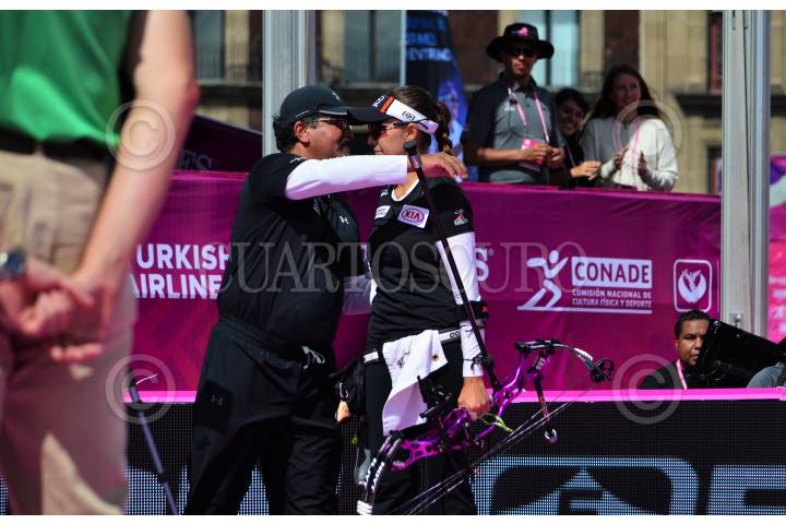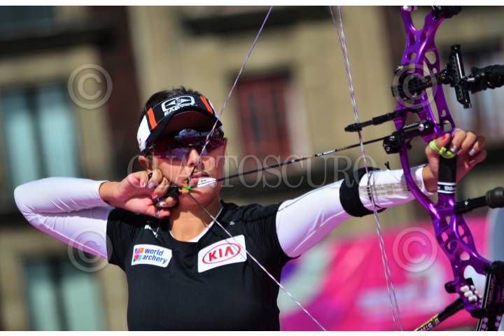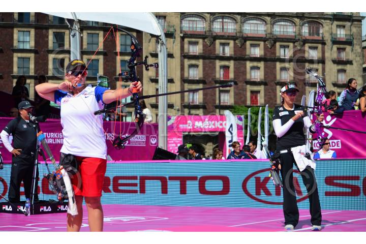 MÉXICO, D.F., 24OCTUBRE2015.- Linda Ochoa, campeona mundial de Tiro con Arco, concluyó la primera ronda eliminatoria de la Copa Mundial de Tiro con Arco 2015, y logró pasar a la etapa de semifinales, después de competir contra la estadounidense Cristal Gabin. El torneo internacional transcurre en estos momentos en el Zócalo capitalino. FOTO: MARÍA JOSÉ MARTÍNEZ /CUARTOSCURO.COM