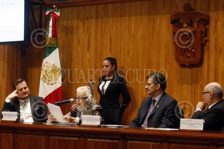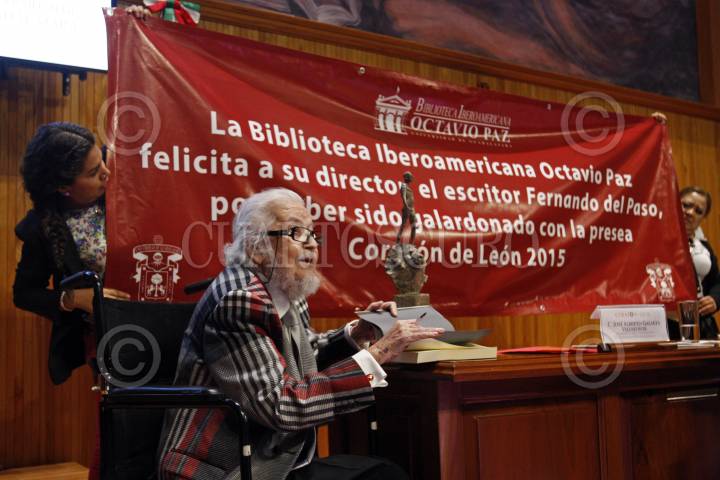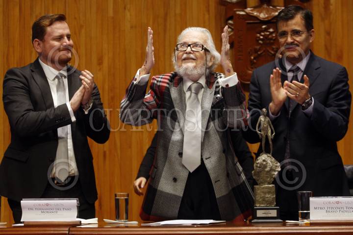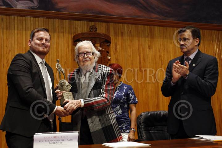 GUADALAJARA, JALISCO. 10SEPTIEMBRE2015.-El escritor Fernando del Paso recibió de manos del Presidente de la Federación de Estudiantes Universitarios, Alberto Galarza, la estatuilla del Galardón Corazón de León en su séptima edición, en ceremonia realizada en el Paraninfo Enrique Díaz de León y en la cual estuvo presente el Rector General, Tonatiuh Bravo Padilla. FOTO: FERNANDO CARRANZA GARCIA / CUARTOSCURO.COM