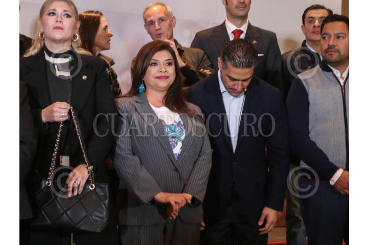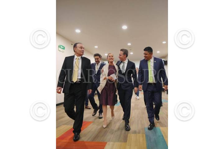 CIUDAD DE MÉXICO, 06SEPTIEMBRE2023.- Claudia Sheinaum llega al WTC para estar presente en el anunció de quien ganó las encuesta que designará a la candidata o candidato de Morena. La escoltan Alfonso Durazo, Jesús Sesma, Manuel Velasco, y Ricardo Gallardo. FOTO: CORTESÍA/CUARTOSCURO.COM