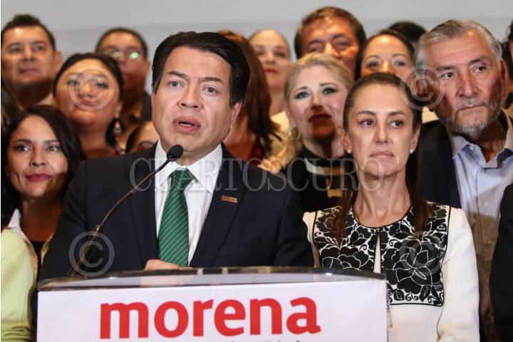CIUDAD DE MÉXICO, 16OCTUBRE2023.- Mario Delgado y Claudia Sheinbaum, encabezaron conferencia de prensa con aspirantes a candidaturas de los estados por Morena, donde dieron detalles FOTO: ANDREA MURCIA /CUARTOSCURO.COM