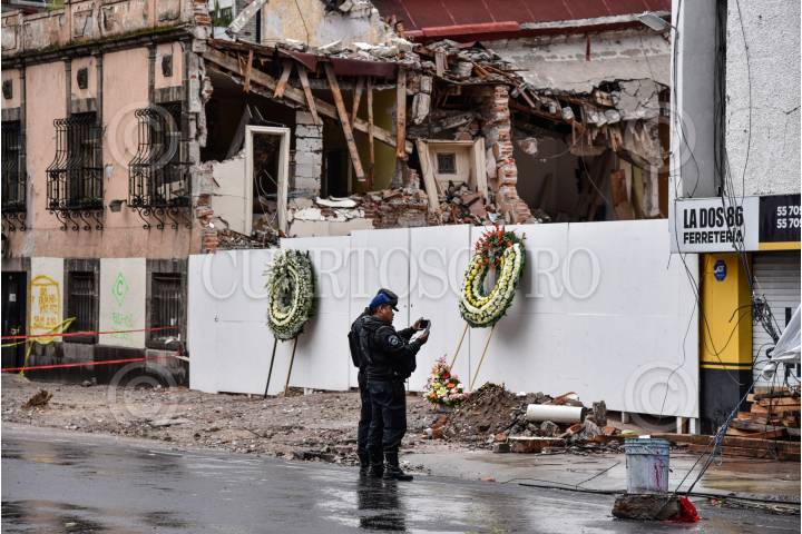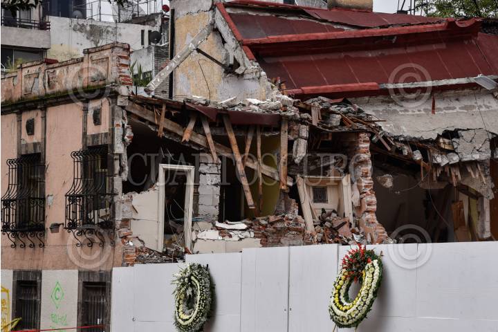 CIUDAD DE MÉXICO, 30SEPTIEMBRE2017.- Coronas florales fueron colocadas en homenaje a las víctimas de la casa habitacional ubicada entre Salamanca y Puebla derrumbada por el sismo del pasado 19 de septiembre. FOTO: MARIO JASSO /CUARTOSCURO.COM