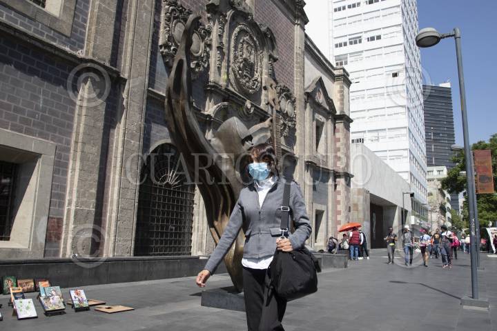 Una mujer pasea camina por calles de la ciudad usando un tapabocas. La Ciudad de México es la entidad con mayores casos de contagios confirmados y la que concentra la mayor tasa de mortalidad por Coronavirus.