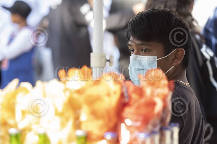 Un joven que atiende un puesto ambulante se protege con cubrebocas, despues del anuncio de que la Ciudad de México es la entidad con mayores casos de contagios confirmados y la que concentra la mayor tasa de mortalidad por Coronavirus.