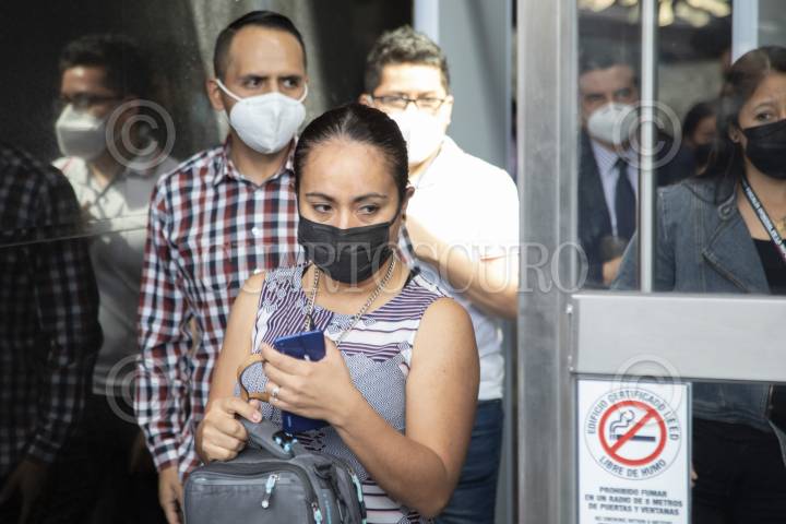 Algunas personas salen de una oficina usando cubrebocas, después de que se informara que la Ciudad de México es la entidad con mayores casos de contagios confirmados y la que concentra la mayor tasa de mortalidad por Coronavirus.
