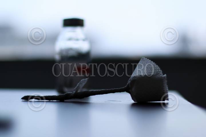 Una "Rosa de Covid" hecha por Juan Felipe Rosas Ramírez, paciente en ecuperación de Covid-19, luce sobre su mesa.