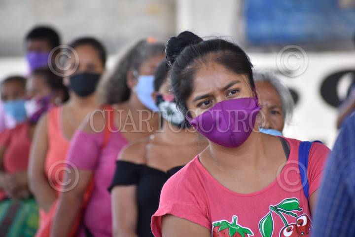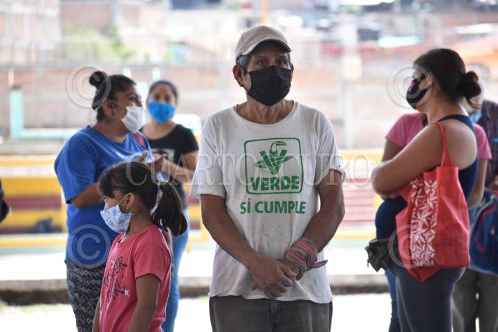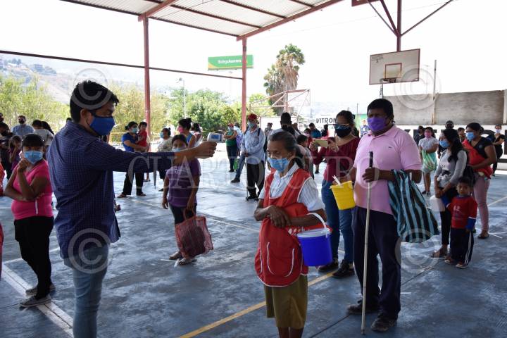 Para acudir a los comedores comunitarios donde se reparte comida a las familias afectadas por la contingencia sanitaria ocasionada por el COVID-19, se les pide a los beneficiarios acudir con cubrebocas y se les toma la temperatura para evitar contagios.