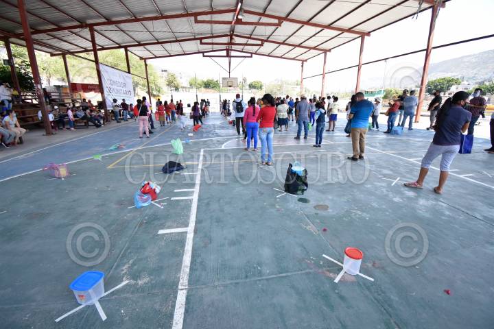 En los comedores comunitarios donde se reparte comida a las familias afectadas por la contingencia sanitaria ocasionada por el COVID-19, se les pide a los beneficiarios guardar la sana distancia y acudir con cubrebocas.