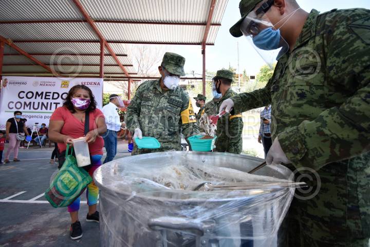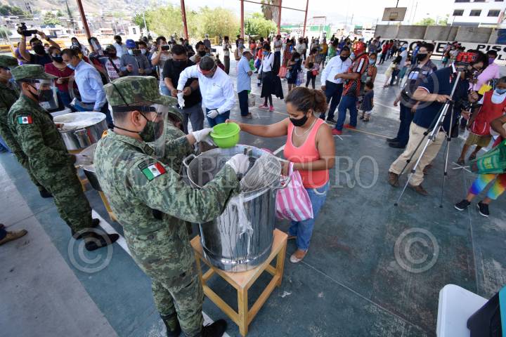 Elementos del ejército reparten comida a las familias afectadas por la contingencia sanitaria ocasionada por el COVID-19 en los comedores comunitarios.