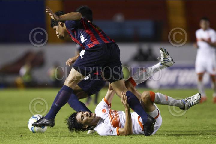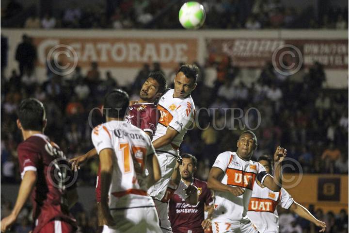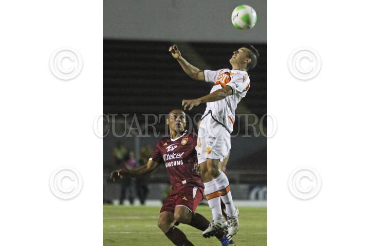 ZAPOPAN, JALISCO, 01MAYO2014.- Ayer por la noche los Correcaminos de la UAT y los Estudiantes Tecos se enfrentaron en el partido correspondiente a las finales de ida del Torneo Clausura 2014 de la Liga de Ascenso MX en el Estadio 03 de Marzo. En la imagen el jugador de Estudiantes Taufic Guarch se disputa el balón frente al contario de Correcaminos, Pierre Ibarra. FOTO: FERNANDO CARRANZA GARCIA /CUARTOSCURO.COM