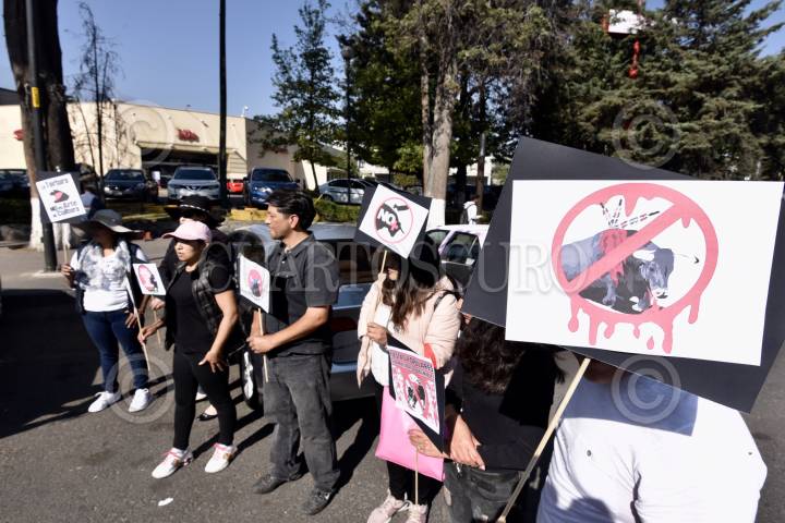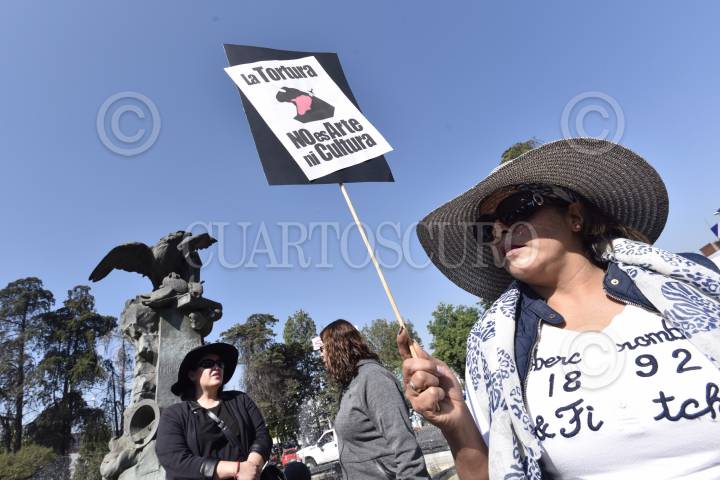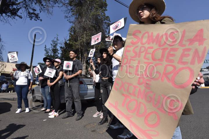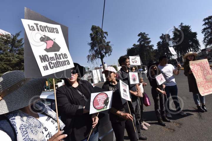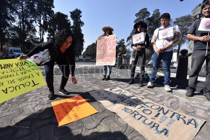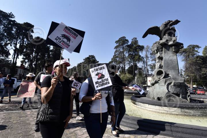 TOLUCA, ESTADO DE MÉXICO, 11MARZO2019.- Algunos ciudadanos se manifestaron en el Monumento al Centenario de la Independencia, en contra de la próxima corrida de toros que se llevará a cabo en la Villa Charra, en la ciudad de Toluca, exigiendo a las autoridades municipales y estatales se detenga este evento. FOTO: ARTEMIO GUERRA BAZ /CUARTOSCURO.COM