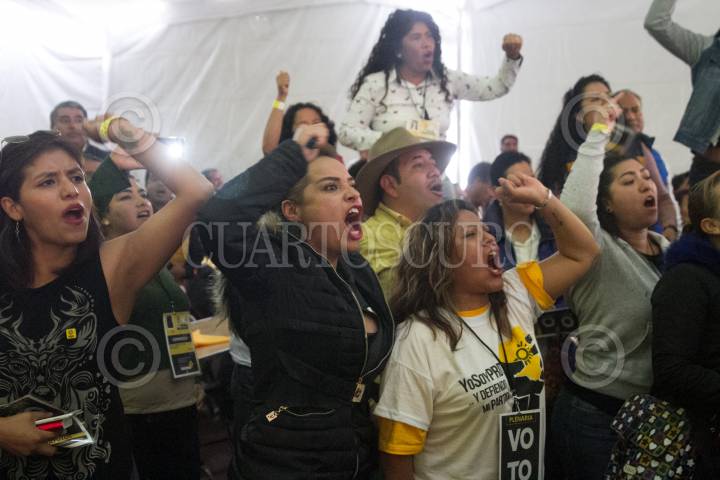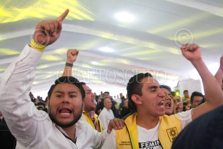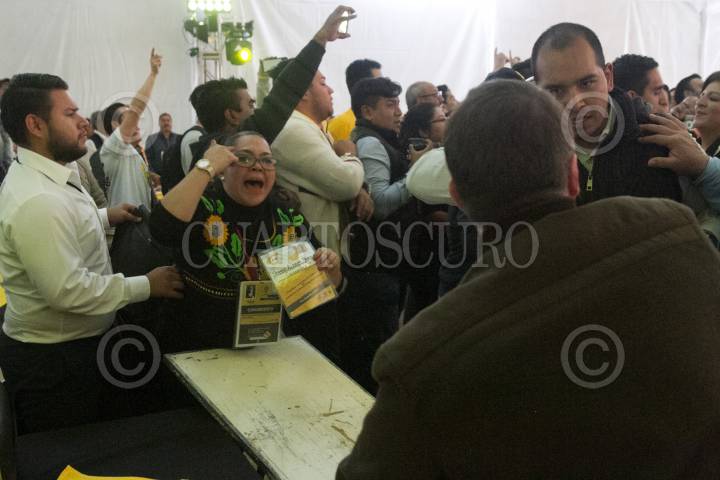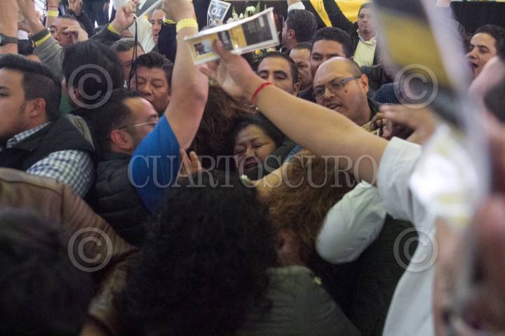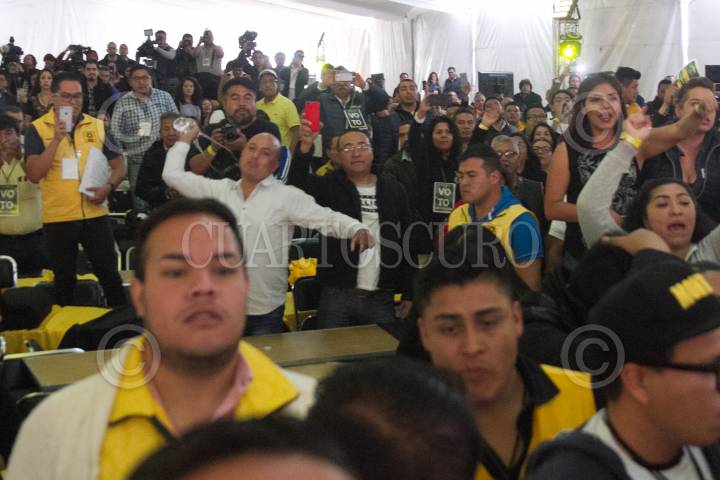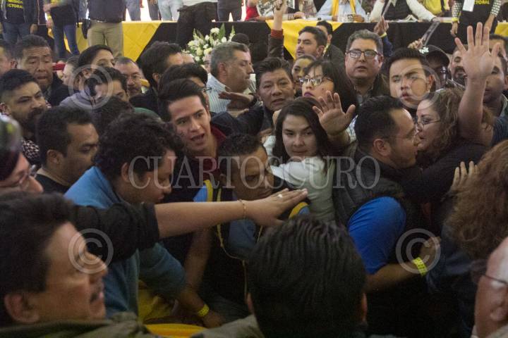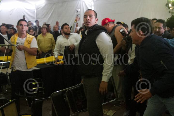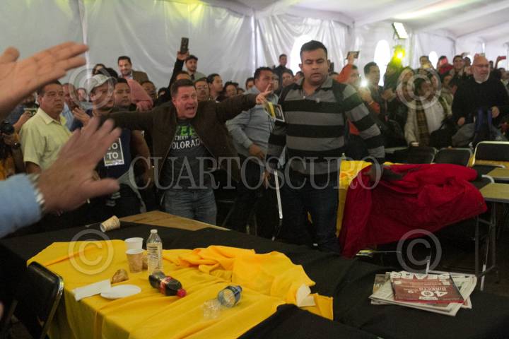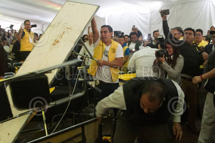 CIUDAD DE MÉXICO, 18NOVIEMBRE2018.- El Consejo Nacional del Partido de Revolución Democrática avaló en lo general la disolución de la actual dirigencia y la eliminación de las corrientes internas, en su lugar habrá una Dirección Nacional Extraordinaria, conformada por cinco integrantes, esto último provocó el desacuerdo de varios de los consejeros ahí presentes que alegaron que no dieron pie al debate de estas resoluciones y fue por imposición, por momentos ambos bandos intercambiaron sillazos, botellazos e insultos, Camerino Márquez quien leyó el resolutivo llamó al orden y tras minutos tensos mando a receso en lo que se calmaban los ánimos. FOTO: MOISÉS PABLO /CUARTOSCURO.COM