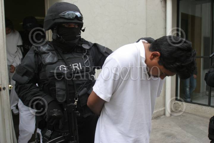 MÉXICO, D.F., 14MARZO2011.- Personal de la Procuraduria de Justicia del Distrito Federal, presentaron ante los medios de comunicación a cinco personas que presuntamente se dedicaban al secuestro, entre los detenidos hay dos policías ministeriales del Distrito Federal pertenecientes a la coordinaciones territoriales 2 y 5 de la delegación Cuahutemoc. FOTO: SAÚL LÓPEZ/CUARTOSCURO.COM