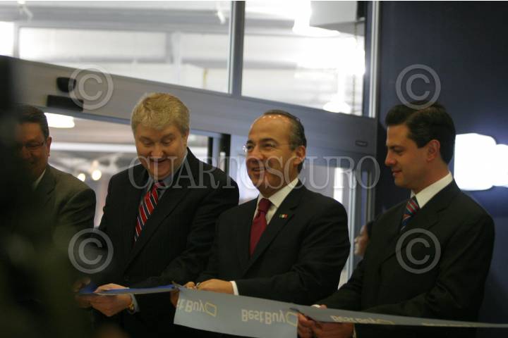 MÉXICO, D.F., 05DICIEMBRE2008.- Bob Willete Presidente Ejecutivo de Best Buy International, Felipe Calderon Hinojosa Presidente de México, Enrique Peña Nieto Gobernador del estado de México, cortan el listón durante la inaguración de Best Buy México, ubicado en el centro comercial Mundo E. FOTO: SÁSHENKA GUTIÉRREZ/CUARTOSCURO.COM