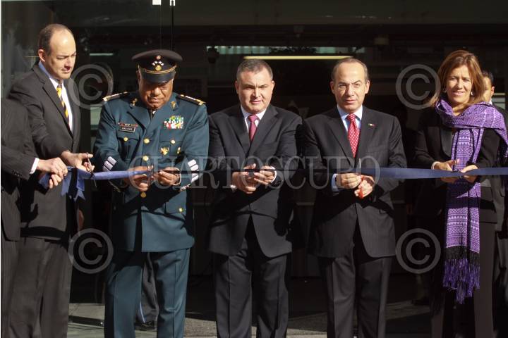 MÉXICO, D.F., 24NOVIEMBRE2009.- Arturo Chavez Chavez procurador de la república, Guillermo Galván Galván Secretario de la SEDENA, Genaro García Luna titular de la SSP Federal, Felipe Calderón Presidente de México, Margarita Zavala Primera Dama de México, cortan durante la inaguración del Centro de Inteligencia de la Policía Federal. FOTO: SÁSHENKA GUTIÉRREZ/CUARTOSCURO.COM