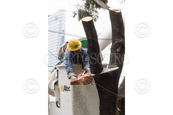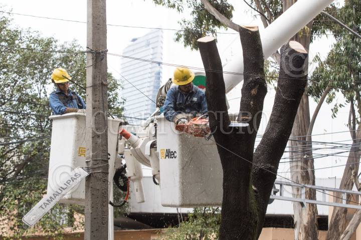 Trabajadores de la CFE cortan varios troncos de un árbol en la Condesa