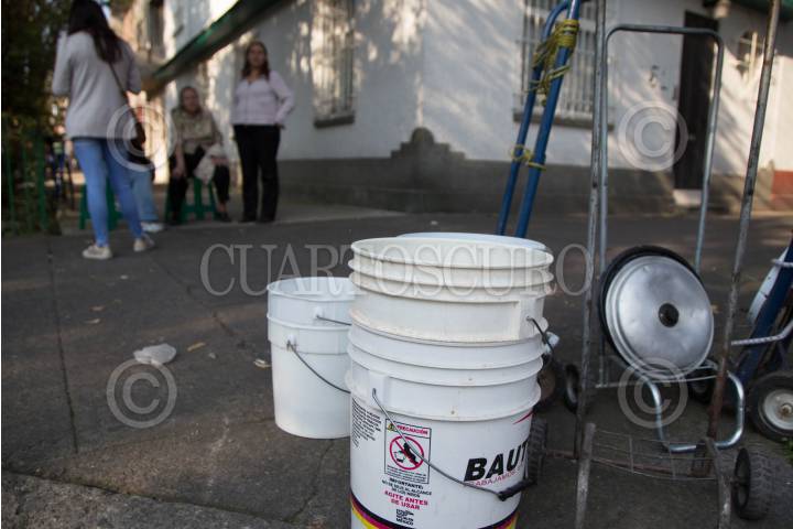 Trabajadores de pipas de agua llenaron botes con el vital líquido a vecinos de la Unidad Habitacional Minas Polvorilla Acapatzingo, alcaldía Iztapalapa debido al corte de agua por las obras realizadas en Cutzamala