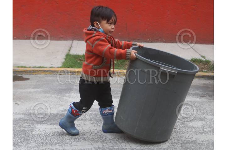 Un niño arrastra un bote de agua en la colonia Minas Polvorilla, alcaldía Iztapalapa