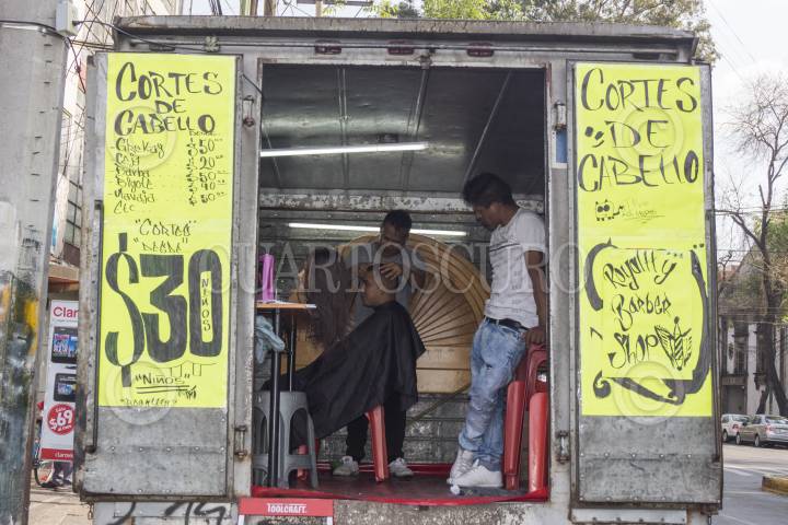 MÉXICO, DF., 03FEBRERO2014.- No es de redilas pero sí es un estética móvil. "Sólo hacemos cortes para caballeros, tengo aquí desde el 28 de enero, espero que me vaya bien", menciona el barbero, como se refirió a sí mismo en esta unidad sobre cuatro ruedas. FOTO: MARÍA JOSÉ MARTÍNEZ /CUARTOSCURO.COM