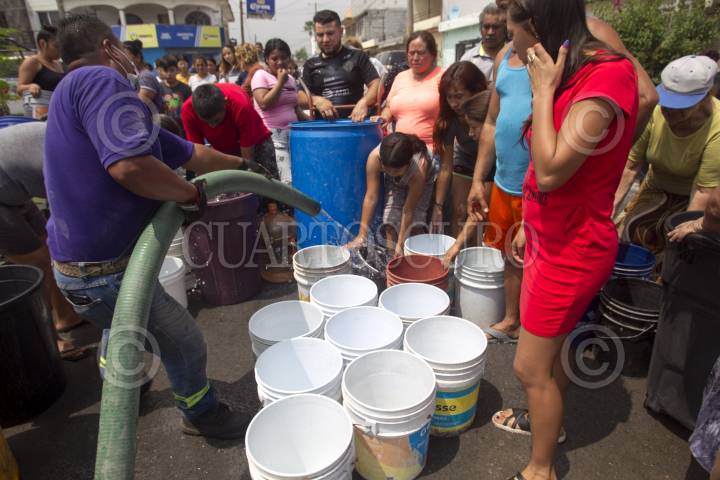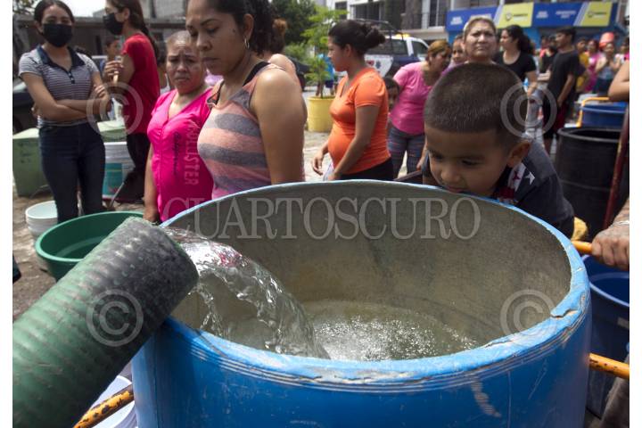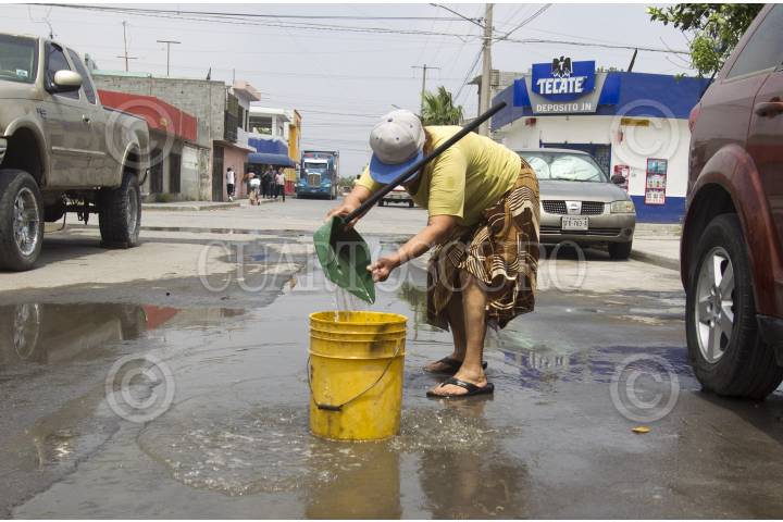 Una señora recolecta agua del piso que va dejando la pipa de agua que abastece a familias afectadas por cortes de agua.