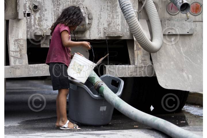 Una niña recolecta agua de una fuga de la manguera de la pipa que abastece a familias afectadas por cortes de agua.