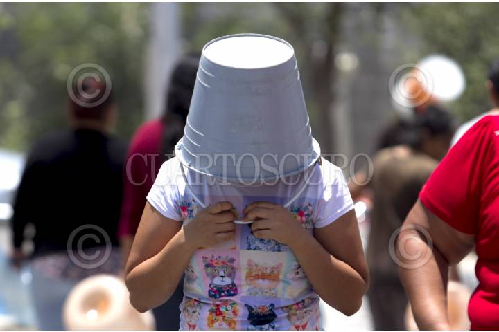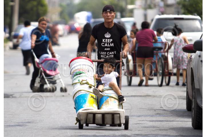Una mujer cubre su rostro del sol con una cubeta, después de no alcanzar agua de la pipa que llegó a su colonia en el municipio de García, Nuevo León.