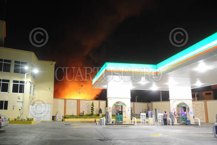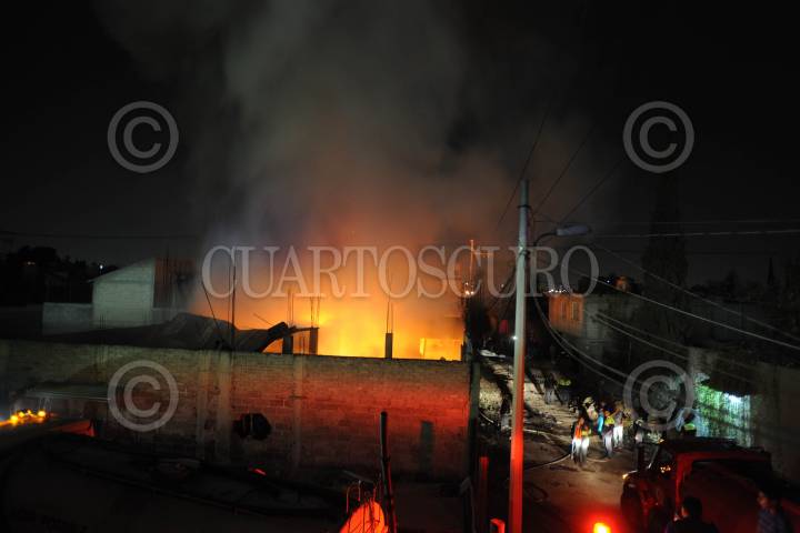 ECATEPEC, ESTADO DE MÉXICO., 08ABRIL2016.- Fuerte incendio consumió una empresa de reciclado de plásticos, ubicada en la calle Nogales y Jazmín en la colonia Ejidos de San Cristóbal. Personal de bomberos de este municipio, lograron controlar el incendio evitando que se propagara a una gasolinera que se ubica a unos metros de este lugar. FOTO: LUIS CARBAYO /CUARTOSCURO.COM