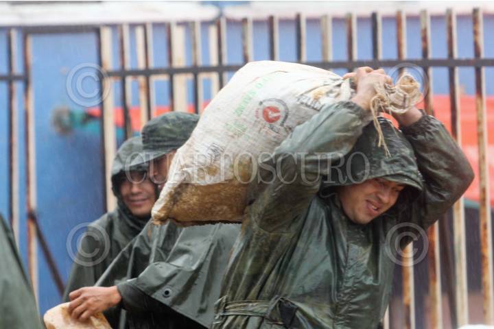 Soldados del Ejército Mexicano y policías estatales se encuentran reforzando las orillas del Río Grijalva con costales de arena, a la altura del malecón Carlos A. Madrazo, ya que hay filtraciones de agua debido a que ha incrementado su caudal.
