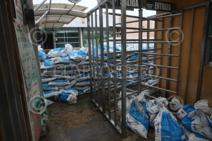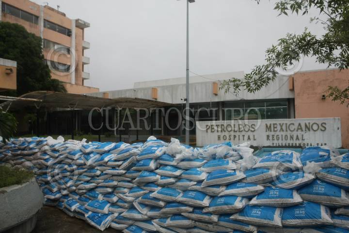 Se colocan costales en el Hospital Regional de Pemex, como medida preventiva ante pronóstico de lluvias torrenciales, creando una barrera con los colores azul y blanco. Incluso fueron colocados en las entradas y torniquetes.