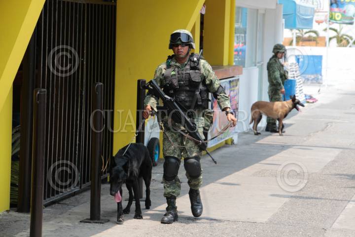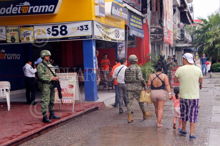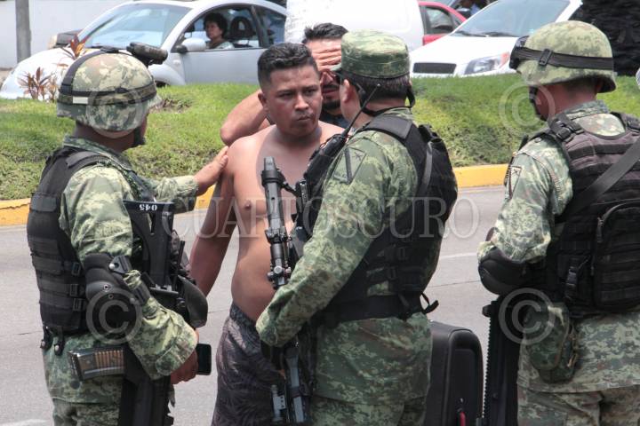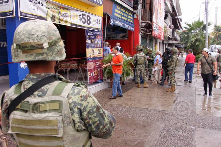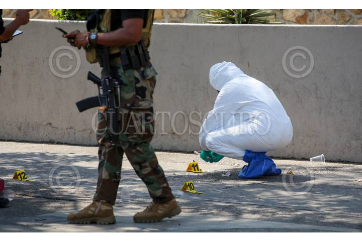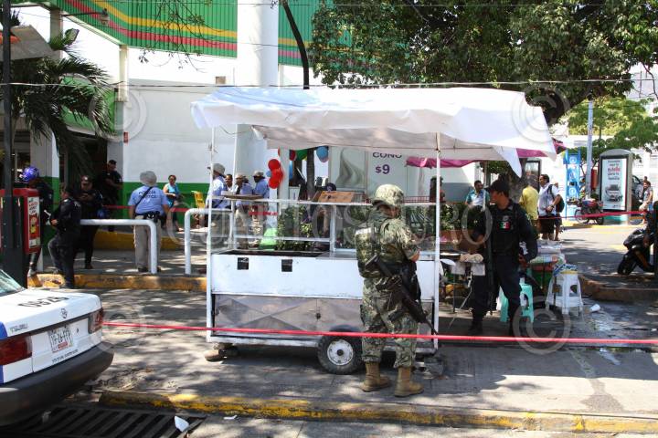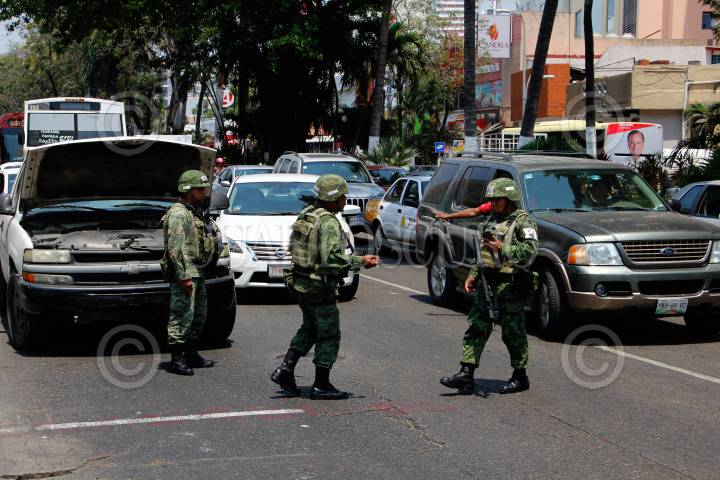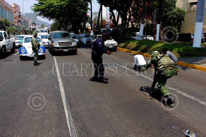 ACAPULCO, GUERRERO, 26ABRIL2018.- Soldados y policías buscan casquillos percutidos, luego de que un hombre robara un taxi en la costera Miguel Alemán, frente al centro comercial Galerías Acapulco, desatándose una persecución a balazos entre el ladrón del taxi y presuntos escoltas, resultando herido el asaltante, el hecho provoco temor entre personas que se encontraban en el lugar. FOTO: CARLOS ALBERTO CARBAJAL /CUARTOSCURO.COM