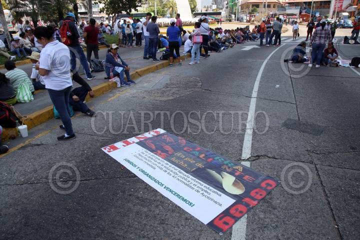 ACAPULCO, GUERRERO, 13MARZO2019.- Maestros de la Coordinadora Estatal de los Trabajadores de la Educación de Guerrero (CETEG) acompañados por organizaciones sociales bloquearon la glorieta de La Diana en Acapulco por casi cuatro horas, para exigir a las autoridades el ingreso de maestros al Fondo de Aportaciones para la Nomina Educativa y el Gasto Operativo, lo cual provoco un intenso trafico en la avenida Costera. FOTO: CARLOS ALBERTO CARBAJAL /CUARTOSCURO.COM