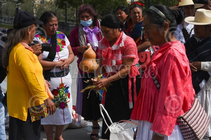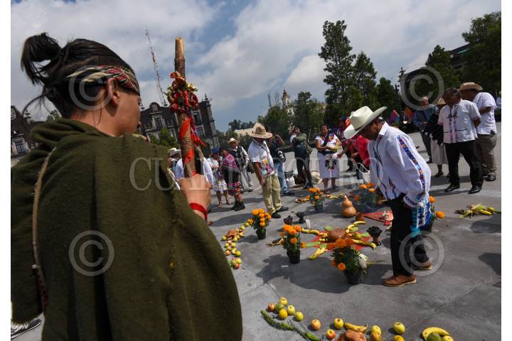 TOLUCA, ESTADO DE MÉXICO, 12OCTUBRE2023.- Integrantes de los pueblos originarios del Estado de México, otomis, mazahuas, tlahuicas, mexicas y matlazincas realizaron una ceremonia ancestral en la Plaza de los Mártires en el marco del Día de la Resistencia Indígena, en un acto de resistencia y defensa de sus costumbres y tradiciones, preservación de su lengua y cultura, exigen reconocimiento y apoyo. FOTO: CRISANTA ESPINOSA AGUILAR /CUARTOSCURO.COM